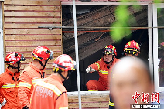 7月24日,辽宁沈阳,消防人员在事发现场紧张救援。当天11时50分许,位于沈阳市大东区黎明三街4号的一家平房小食店屋顶发生坍塌。中新社发 孙昊声 摄