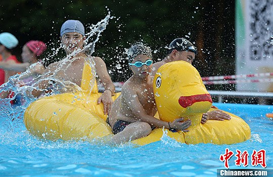 小朋友乘坐“大黄鸭”戏水。泱波 摄