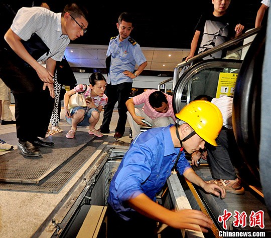 电梯维保人员对自动扶梯下步机械槽进行检查。吴正琪 摄