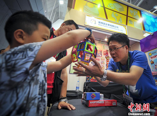 台湾展区一家企业开发的“磁性建构片”益智玩具,吸引小朋友参与其中,一边游戏一边学习数学知识。 刘新 摄