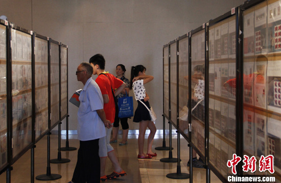 山东省抗战集邮巡回展览24日在烟台开幕,共有64部158框相关主题邮集参展,吸引不少民众参观。