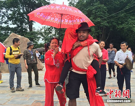 9月12日,在湖南沅陵县举办的第三届山水运动节上,来自亚非欧美17个国家和地区的外国友人零距离体验当地的土家族传统结婚习俗,感觉超爽。