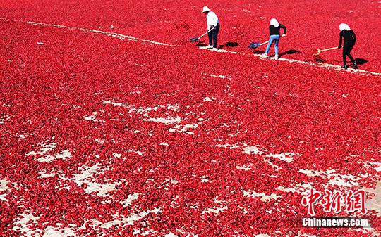 9月12日,地处甘肃西部的玉门市花海镇辣椒农民合作社的工人在晾晒红辣椒。蓝天,白云,成片红红的辣椒,让处于沙漠和戈壁的包围之中的绿洲颜色更加鲜艳。