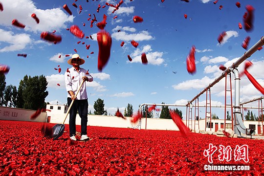 地处甘肃西部的玉门市花海镇辣椒农民合作社的工人在晾晒红辣椒。 裴海博 摄