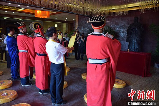 9月28日,在湖北省历史文化名城鄂州,寒溪书院开院并举行祭孔大典,10名小朋友现场朗诵《孔子赞》。