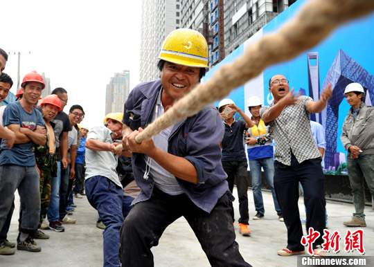 9月29日,在合肥市中建三局一公司置地广场035地块项目工地的农民工运动会上,工人们团结协作、奋力拼搏。中建三局一公司组织国庆假期坚守工地的建设者开展各种趣味运动会,丰富员工节日生活,营造了欢乐喜庆氛围。中新社记者 韩苏原 摄