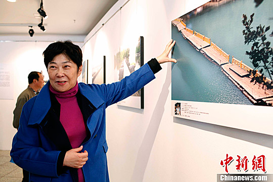 图为著名桥梁专家茅以升之女茅玉麟欣赏古桥追梦摄影展作品。中新社记者 王磊 摄
