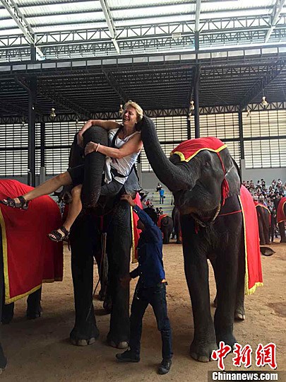 图为大象给游客按摩。中新社记者 陈燕 摄