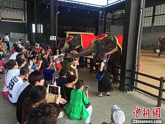 在泰国东芭乐园,会画画、投篮、打保龄球,而且还会按摩的大象吸引了大量游客。中新社记者 陈燕 摄