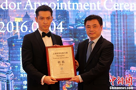 1月4日,上海市旅游局正式聘任胡歌(左)为上海旅游形象大使。中新社记者 张亨伟 摄