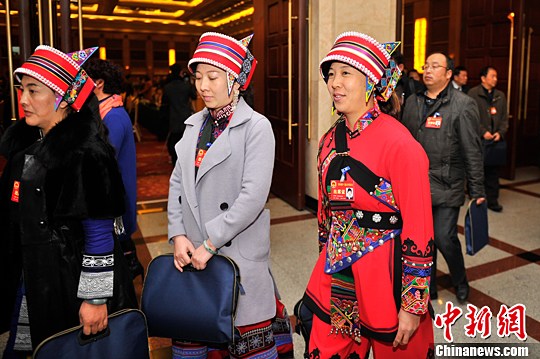 1月13日,少数民族代表着盛装,参加昆明市第十三届人民代表大会第七次会议。中新社记者 刘冉阳 摄