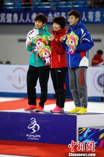 1月22日,第十三届全国冬季运动会短道速滑女子1000米决赛在新疆冰上运动中心短道花样馆举行,来自长春代表队的周洋(中)获得冠军,成绩为01:28.742;其解放军代表队杨扬(左)获得亚军,成绩为01:28.898;来自七台河市代表队的范可新(右)获得季军,成绩为01:28.862。 王小军 摄