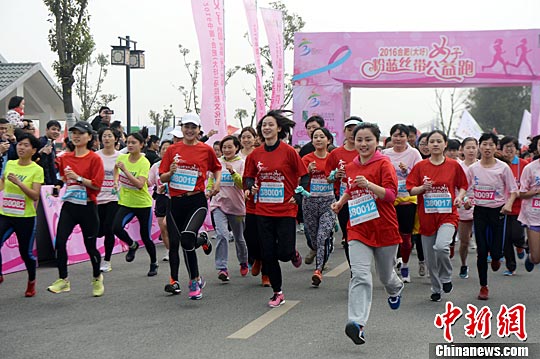 3月6日,安徽女子撑竿跳高名将吴莎(中)领跑。为庆祝即将到来的“三八”国际劳动妇女节,呼吁人们关注女性健康,“2016合肥大圩女子粉蓝公益跑”在安徽合肥大圩的马拉松专用赛道上开跑。中新社记者 张娅子 摄