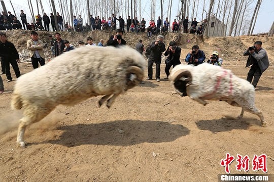 3月23日,河南省滑县白道口镇李河京村边一片空旷的沙荒地上,一场激烈的斗羊赛正在进行。场面激烈,观众直呼过瘾。斗羊是当地民间的一项传统娱乐活动,其角斗场面惊险生动,令人豪气顿生。当地农民利用传统古庙会举办这一传统民俗活动,丰富了群众的娱乐生活,同时祈盼风调雨顺、五谷丰登。
