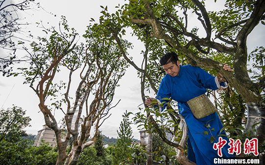 四川长嘴壶茶艺师刘绪敏采摘古茶树。 中新社发 李依凡 摄