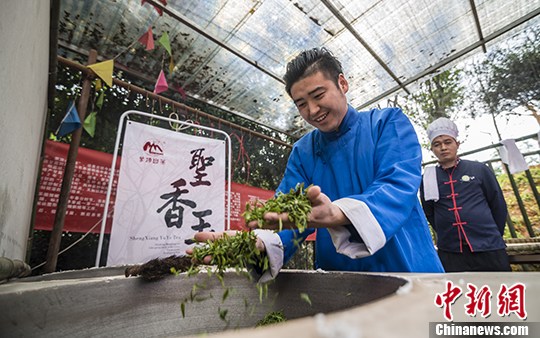 四川长嘴壶茶艺师刘绪敏现场炒制古茶树茶叶。 中新社发 李依凡 摄