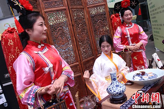 5月3日,女子身穿明清宫廷服饰为茶商站台。当日,参加第五届中国·四川国际茶叶博览会的各大茶商陆续入驻。