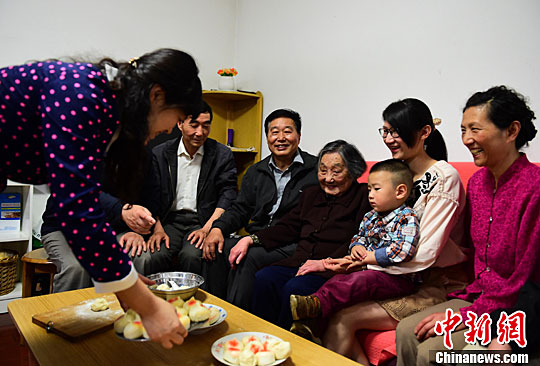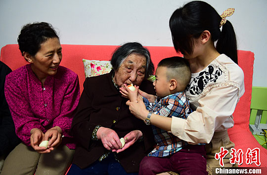 5月5日,社区义工为102岁的百岁老人徐雨田提前过母亲节。中新社记者 钟欣 摄