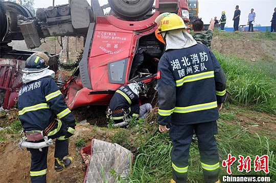 一辆大货车在湖北随县新316国道处180°侧翻。冯少勇 摄