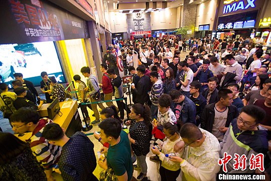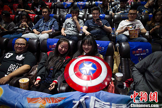5月6日,山西太原,大批影迷为先睹为快,在影院熬夜观看零点场的《美国队长3》。中新社记者 张云 摄