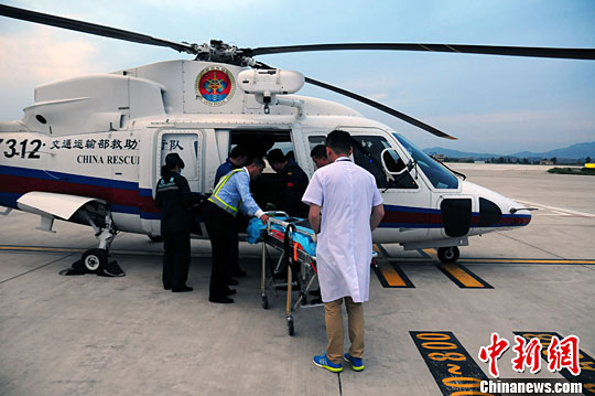 5月26日,在距离威海市东南约300公里海域处,“辽营渔35505”船上一名轮机长在机舱检查机器时头部受伤昏迷,情况紧急。交通运输部北海第一救助飞行队派出救助直升机,将受伤渔民成功救起。中新社发 王军 摄