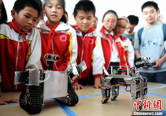 5月27日,学生们围观机器人表演。中新社记者 韩苏原 摄
