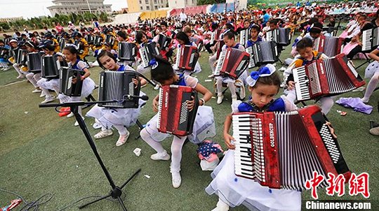 据介绍,是次演奏会以民族和谐为主题,泽普县14个中小学的1000余名乐器爱好者参与。手风琴、葫芦丝、吉他、电子琴、古筝、都塔尔等十几种乐器方队你方奏罢我登场,时而此起彼伏,时而共同发声,雄浑壮阔的乐音响彻方圆两三公里。千人合奏的《娃哈哈》、《祖国进行曲》气势恢宏,震撼了全场观众的心。 卢立锋 摄