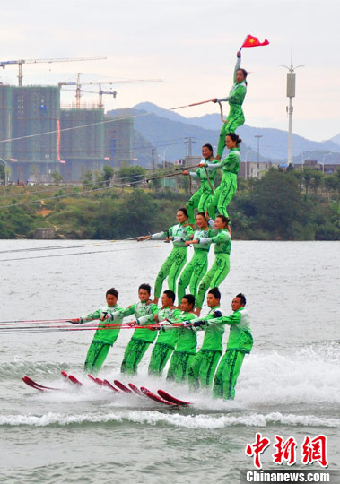 9月30日,2016年中美滑水明星对抗赛在广西柳州举行,中美两国近80名“水上舞者”,在蓝天碧水之间,通过娴熟的动作和精湛的表演,一展“水上芭蕾”之美。中新社记者 周潇男 摄