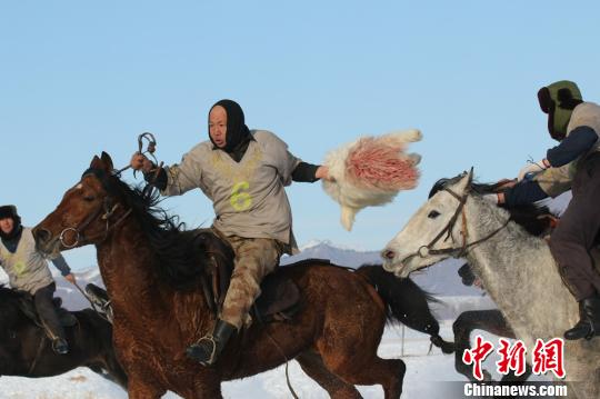 1月7日,“中国天马之乡”新疆昭苏举办冰雪旅游节。当天在天山下的莽莽雪原,哈萨克族骑手举办刁羊比赛,一展其马上绝技。