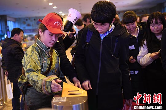 1月15日,山西太原火车站,在当地就读的藏族学生体验春运志愿者工作,为旅客提供服务帮助。