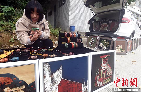 一女孩摆摊出售制作精美的漆画等工艺品。 中新社记者 乐细巾 摄