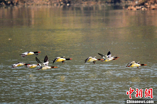 寒冬腊月,江西婺源县紫阳镇坑口村委会石枧村河滩水浅,两岸阔叶林林木葱郁,20多只中华秋沙鸭聚集在此栖息越冬,数量之多为全国罕见。中华秋沙鸭为鸭科秋沙鸭属的鸟类,是中国的特有物种。其分布区域十分狭窄,数量也是极其稀少,全球目前仅存不足1千只,属国家一级保护动物。中华秋沙鸭在中国广有越冬记录,但分布点零散,且多为小群或零星个体,很少在同一地见到10只以上的个体记录。
