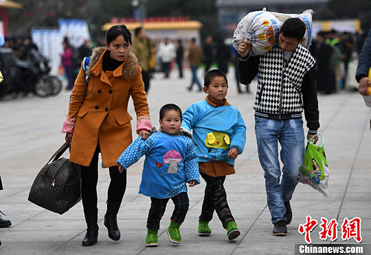 1月16日,重庆火车站南广场上,众多外出务工的旅客扛着大包小包行李踏上了回家的路。