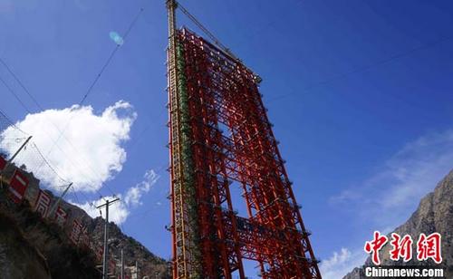 4月11日,拉林铁路全线重点控制工程——藏木雅鲁藏布江特大桥的施工现场。藏木雅鲁藏布江特大桥为中承式提篮钢管混凝土拱桥,主拱计算跨径430米,桥址处海拔3350米。中新社记者 赵延 摄