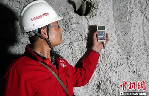 拉林铁路全线重点控制工程——桑珠岭隧道内,技术负责人玄龙通过电子设备探测隧道内岩温高达60摄氏度。中新社记者 赵延 摄