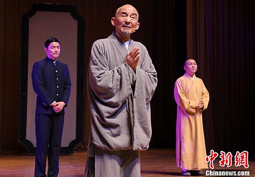 《最后之胜利》由游本昌领衔主演弘一大师。该剧选取弘一大师传奇人生的最后5年,面对日寇的威逼利诱,心如磐石,以生命抗争,汇成“悲欣交集”的生命绝唱。 84岁的游本昌曾在1985年因出演了“济公”成为中国家喻户晓的演员。图为话剧《最后之胜利》演出现场。