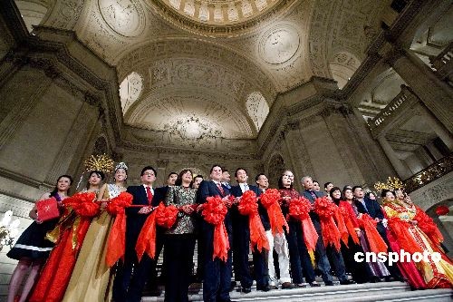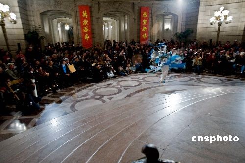 当地时间二月五日,美国旧金山市府牛年新春欢庆会在市政府大厅举行,数百民众前往现场观看。中新社发 陈钢 摄