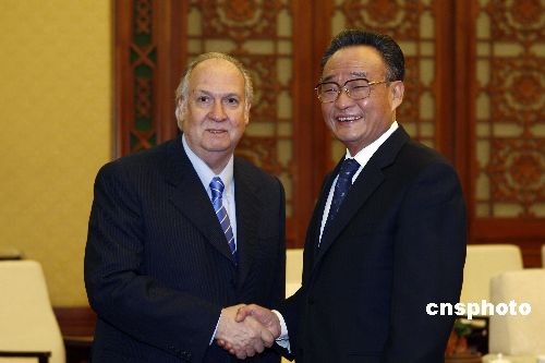 2月18日,全国人大常委会委员长吴邦国在北京人民大会堂会见智利众议长恩西纳。中新社发 盛佳鹏 摄