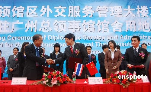 二月二十六日上午,泰国驻穗总领事馆用地在广州赤岗新领馆区举行移交仪式,泰国总领事馆成为首家进驻广州新领馆区的领馆。目前已有三十多个国家在穗设立领事馆,其中有六个国家提出在赤岗领馆区建设永久性馆舍的申请。中新社发 柯小军 摄