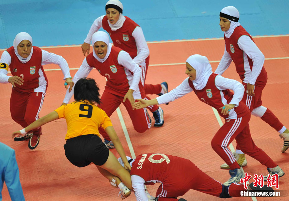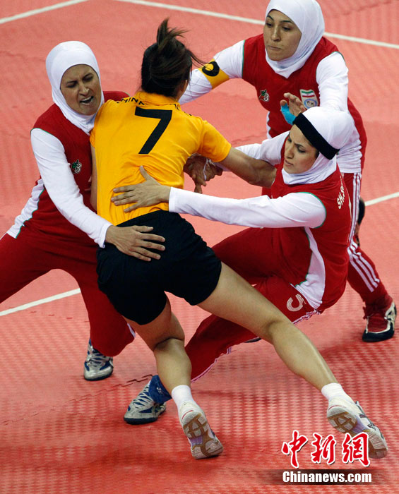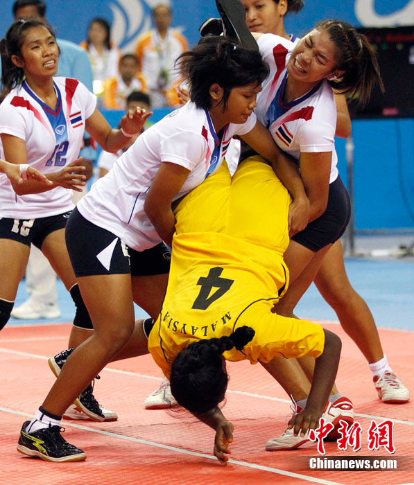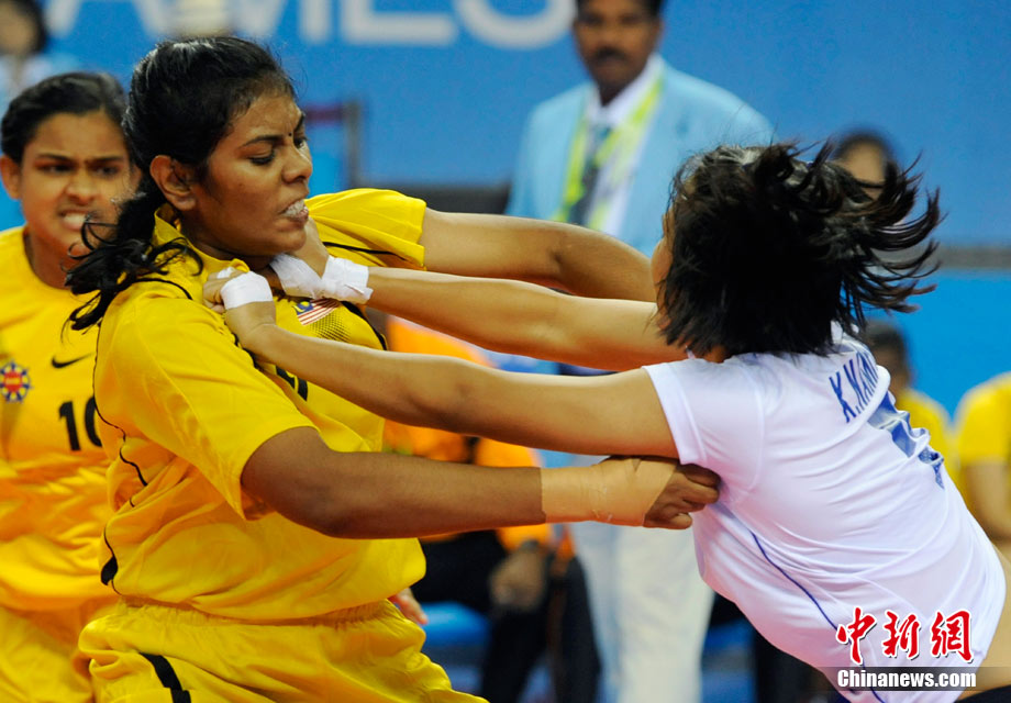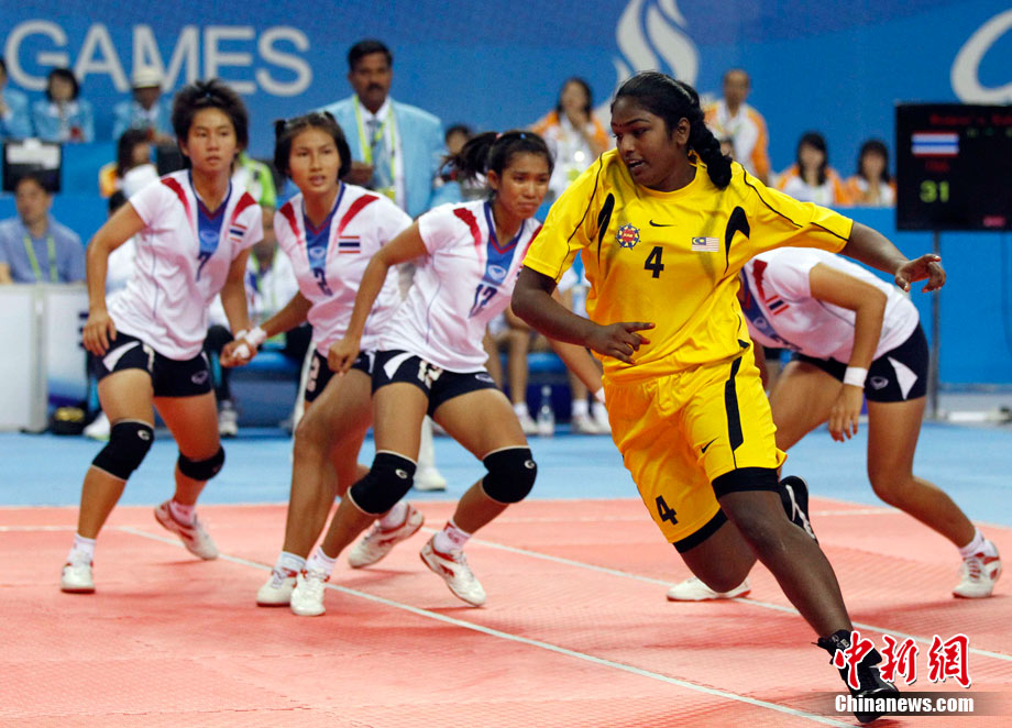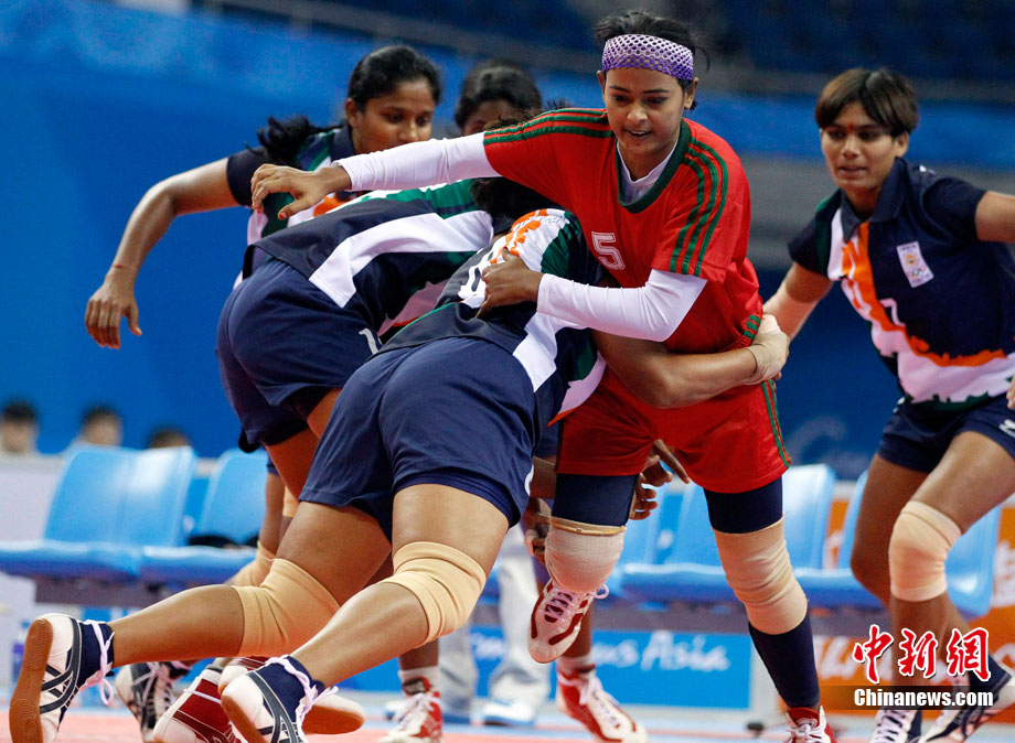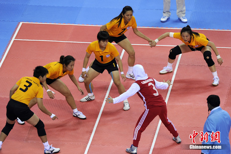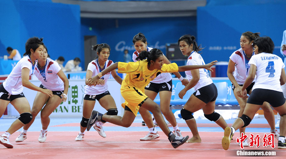 下图:2010广州亚运会女子卡巴迪比赛现场。
