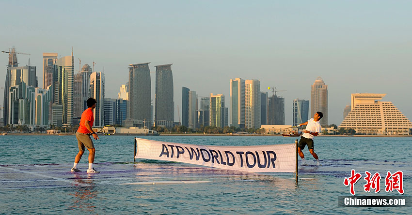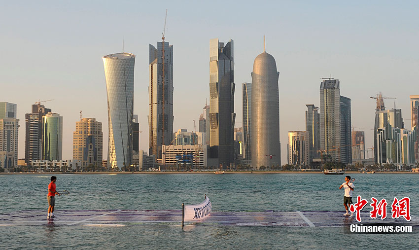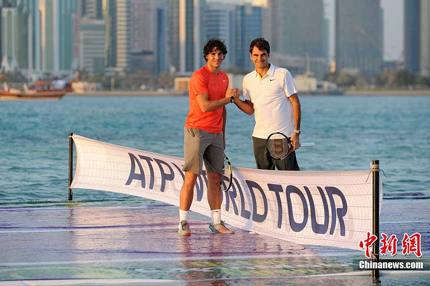 近日,世界男子网球著名选手费德勒和纳达尔来到卡塔尔首都多哈为2011赛季ATP巡回赛做起了推广宣传,推广的方法也是格外新颖,两人在水中打了一场表演赛。