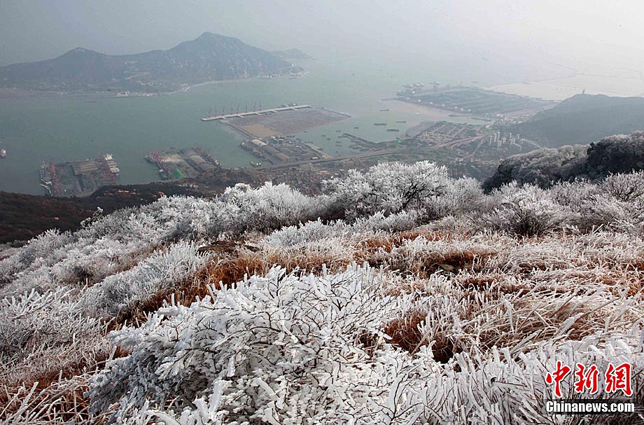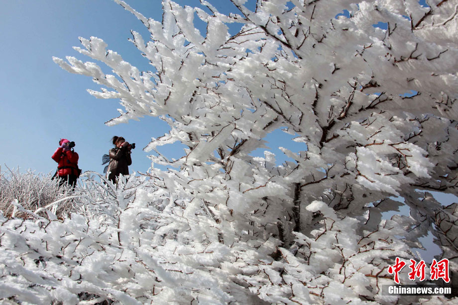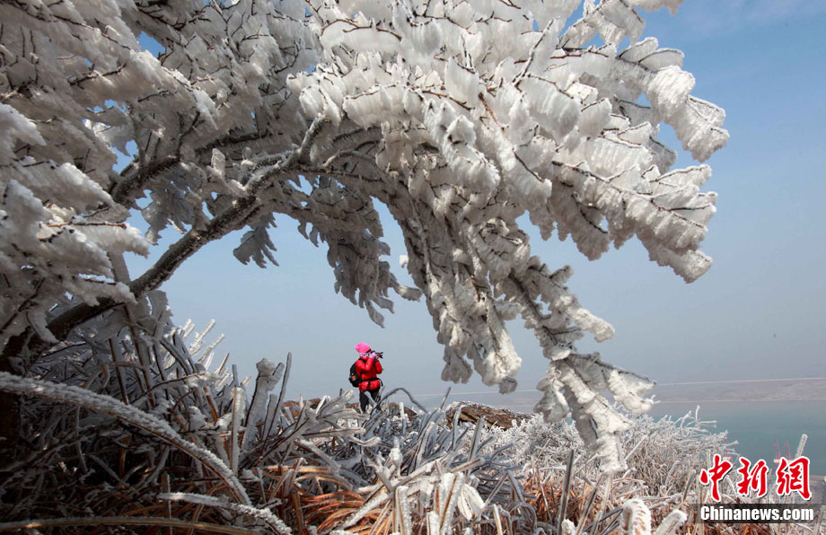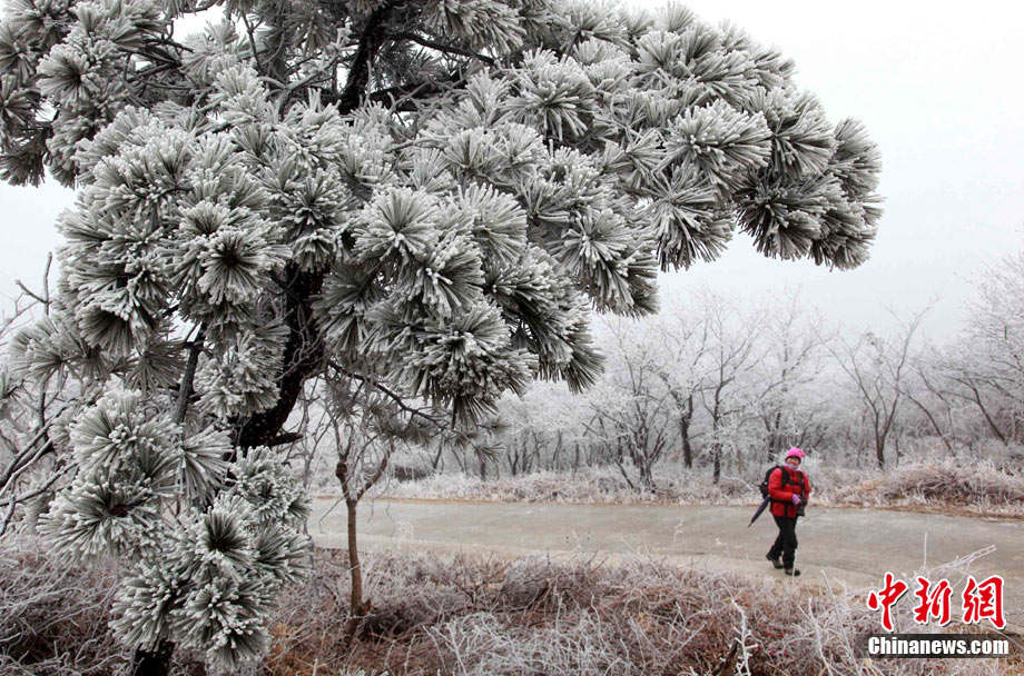 2011年2月28日,受降雨和冷空气双重影响,江苏连云港云台山出现春季难得一见的雾凇美景。整个山脉银装素裹,松枝树条皆被晶莹的雾凇包裹,景色分外迷人。王健民 摄 图片来源:CNSPHOTO
