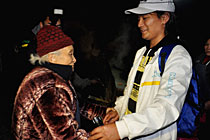 3月5日是藏历新年初一,在北京参加“两会”的全国政协委员宗庸卓玛遇到前来献“切玛”的西藏政协工作人员,互祝“扎西德勒”。中新社记者 刘舒凌 摄