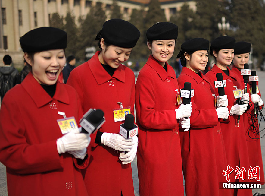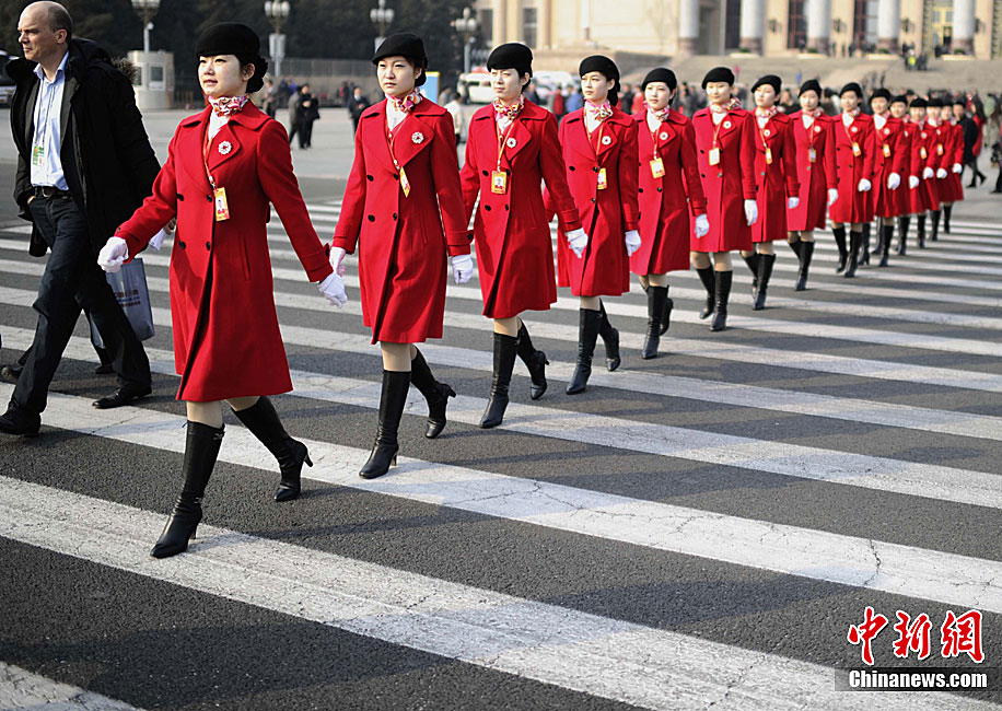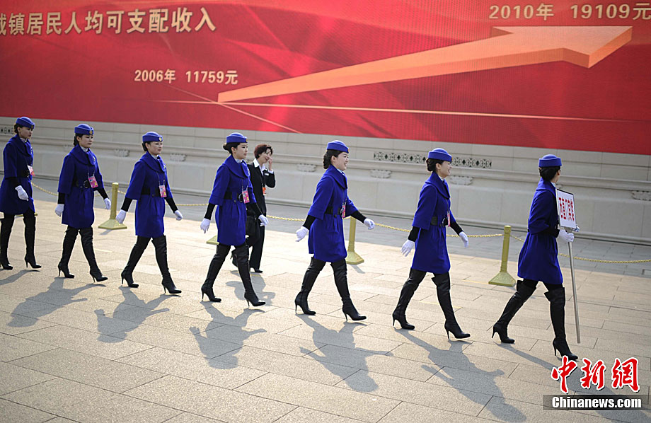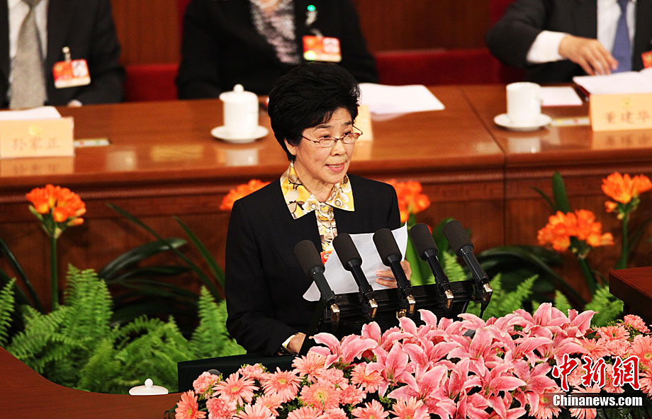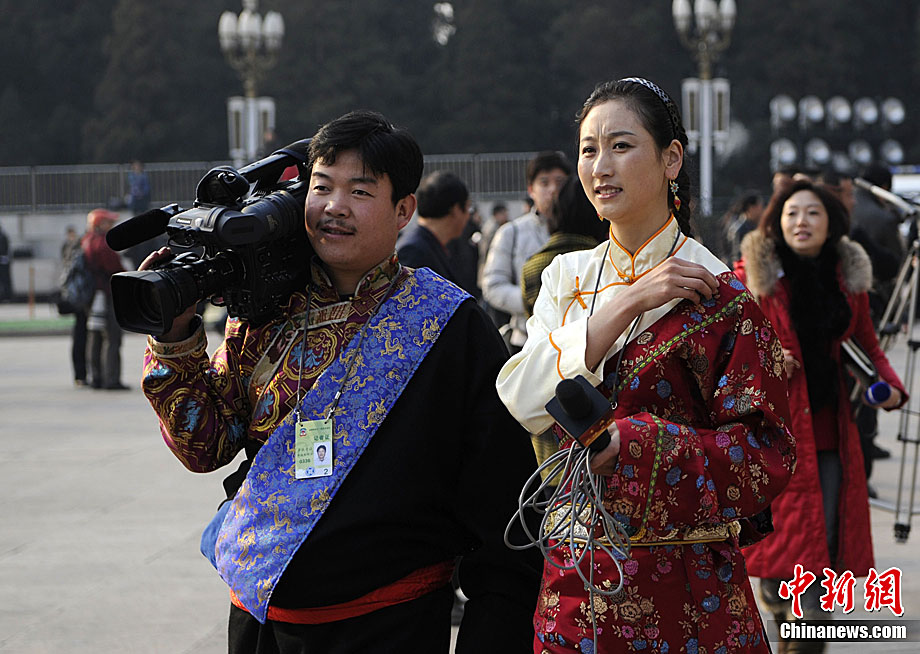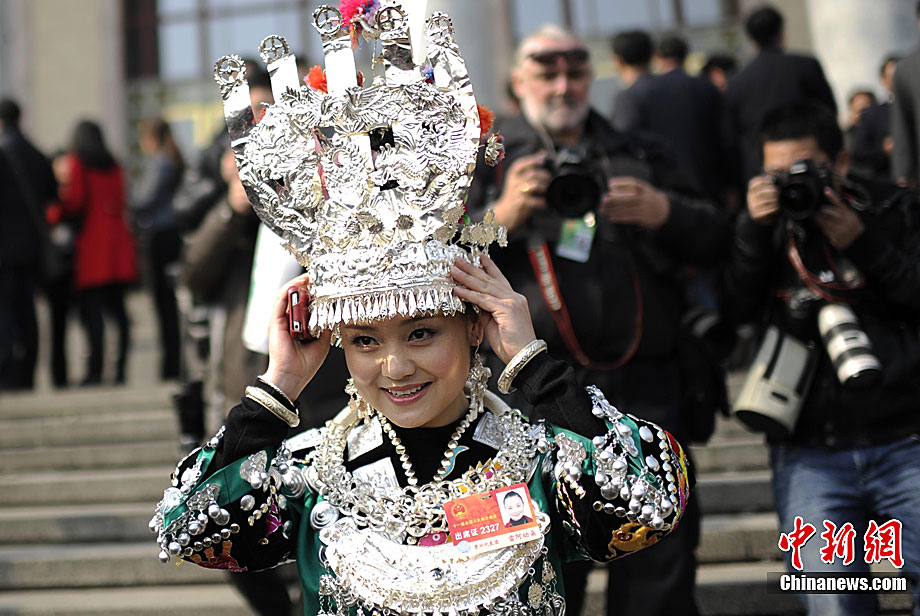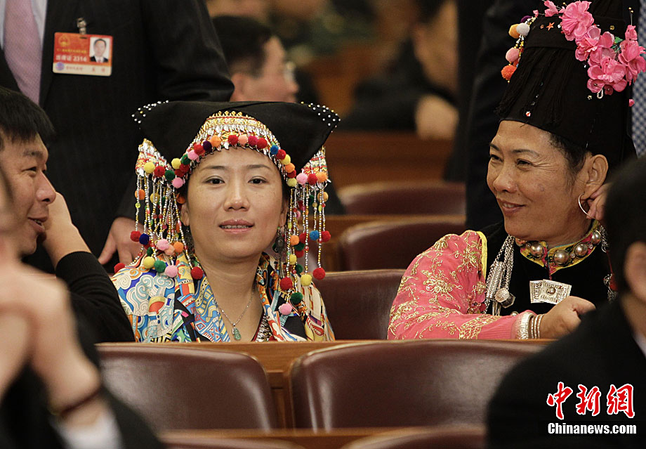 自两会开幕以来,记者的镜头记录了女代表委员、女记者、女服务员在各自的岗位上为两会而忙碌的身影,节日因她们的奉献而更加精彩。图为2011年全国两会在北京人民大会堂举行,少数民族代表身着艳丽的民族盛装出席会议。金立冬 摄 图片来源:CNSPHOTO