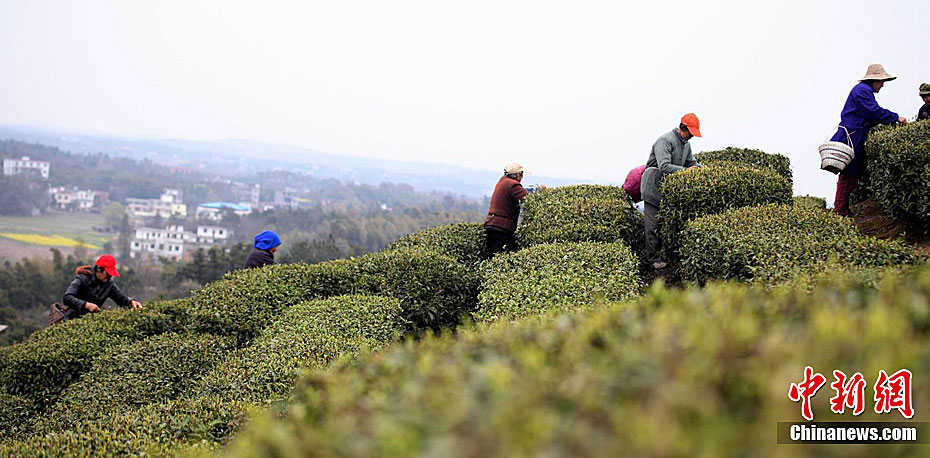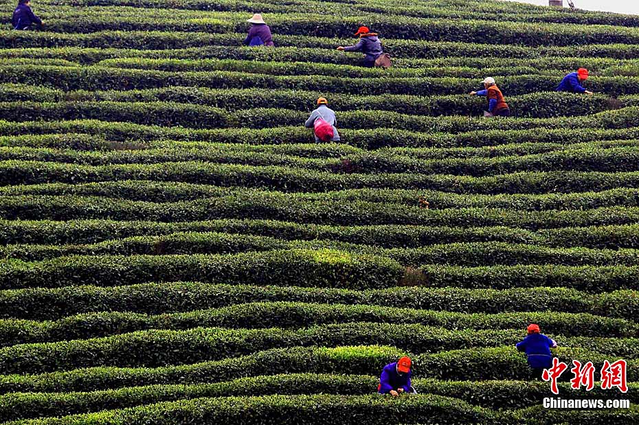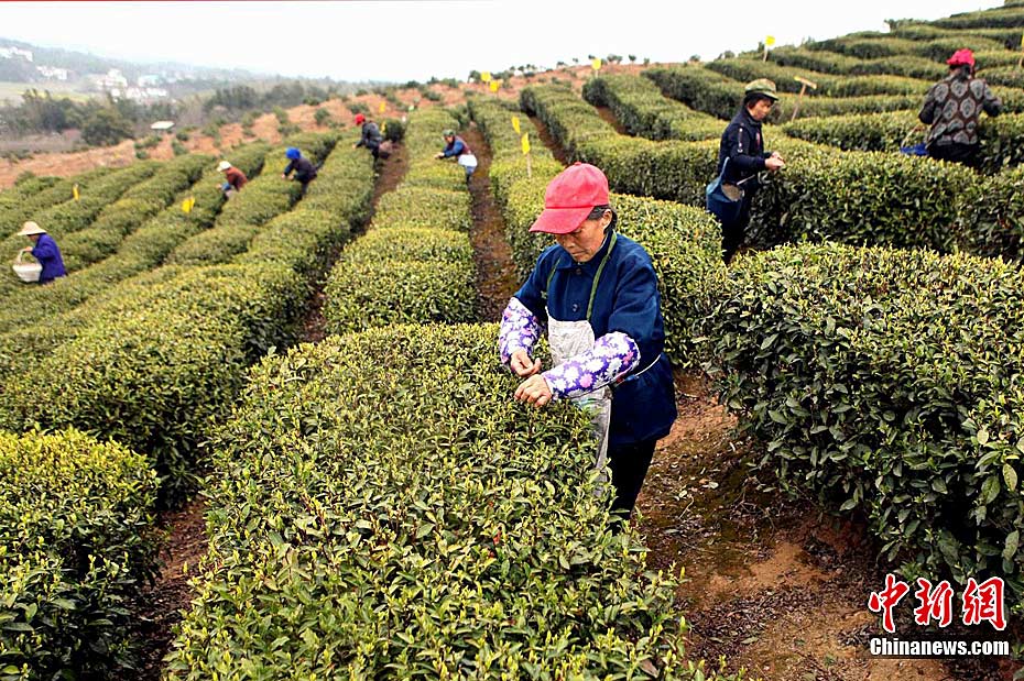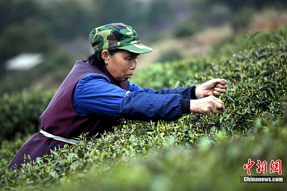3月18日,江西九江市庐山区山北茶厂,采茶工正在采摘今春第一季“庐山云雾”。由于今春以来平均气温较高,今年庐山云雾春茶开采时间比去年早了大约10天,清明节前夕,庐山3万亩茶园春茶开采,品质最好的庐山云雾茶“明前茶”将进入市场。张海岩 摄
