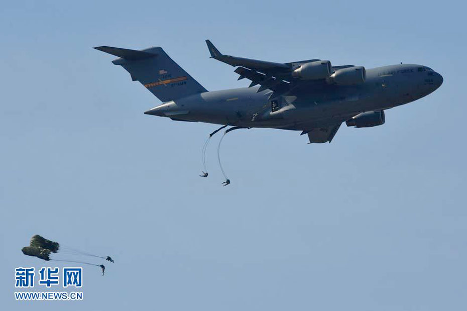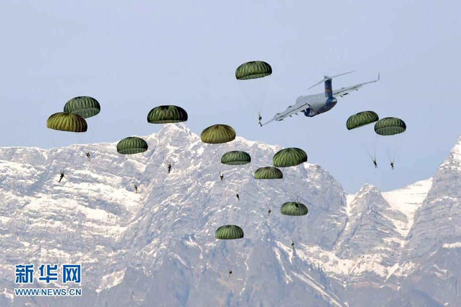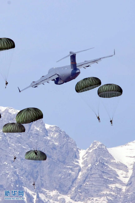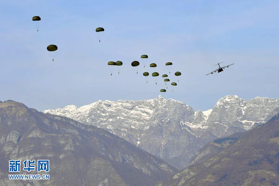 3月22日,美国空军伞兵部队在意大利阿维亚诺空军基地附近的马尼亚戈上空举行空降演习。图片来源:新华网