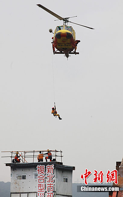 3月25日,台湾首次“复合型灾害防救演习”在新北市举行,演习分别模拟水灾、泥石流、地震、海啸及核灾发生后,救援人员现场施救的过程,希望藉此提升当地及当局应灾能力。图为演习直升机在进行现场救援。中新社发 符永康 摄