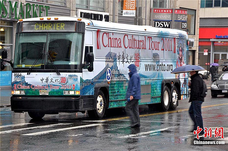 中国驻纽约旅游办事处于2011年4月至6月在纽约推出为期84天醒目的“2011年中华文化游”巴士广告,十辆贴满中国旅游形象-长城与京剧画面的公共汽车,穿行在纽约市的大街小巷,向纽约市民和来自世界各国的游客传递着“中国欢迎你”的热情洋溢的信息。中国国家旅游局将2011年海外旅游推广主题确定为“2011年中华文化游”。中新社发 孙宇挺 摄