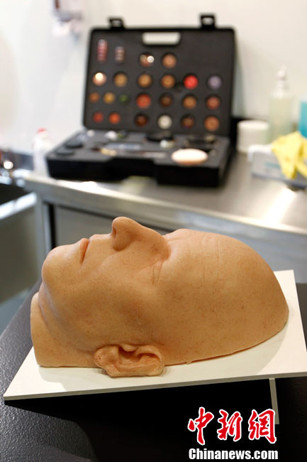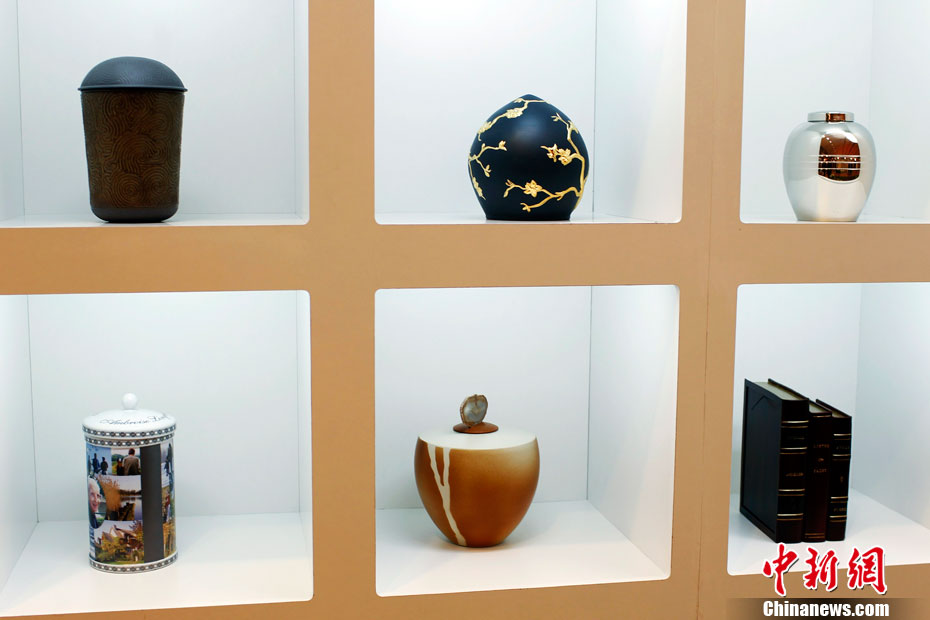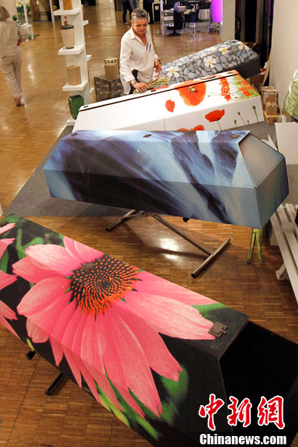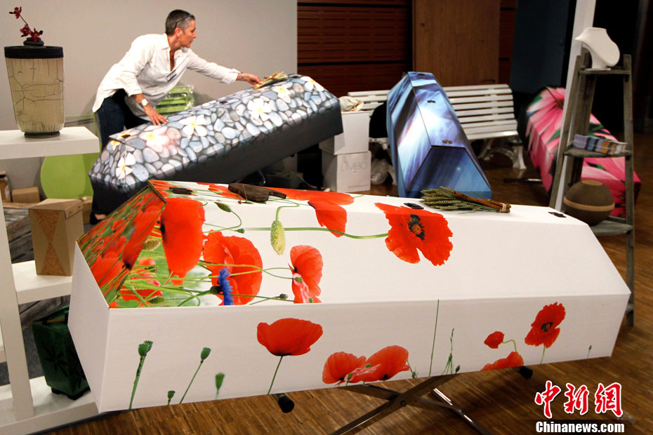 2011年4月7日,法国巴黎国际丧葬用品展举行,此次展览为期三天,共有大约100家丧葬用品公司参加了此次展览。图为一家电视台记者“试用”棺材,并进行现场解说。