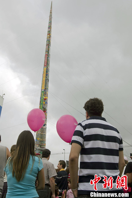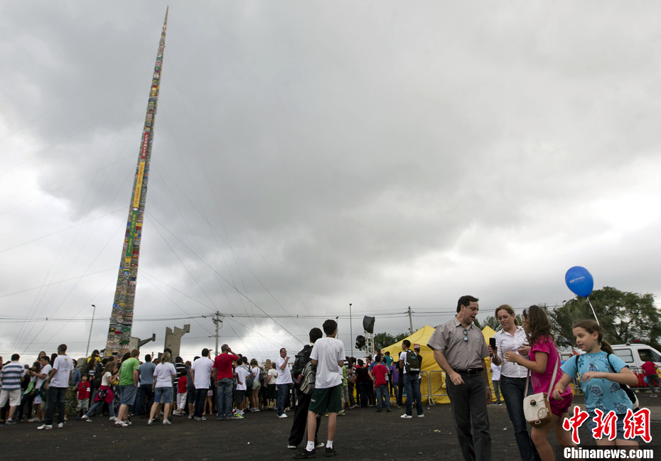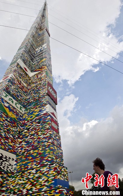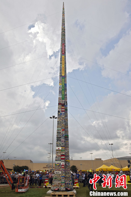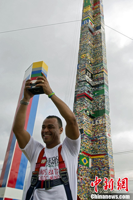 2011年4月9日,巴西圣保罗,巴西前足球运动员卡福拼出世界最高乐高积木塔,高达31.19米,比前世界纪录高出25厘米。图为卡福将最后一块积木安放在乐高积木塔的顶端。